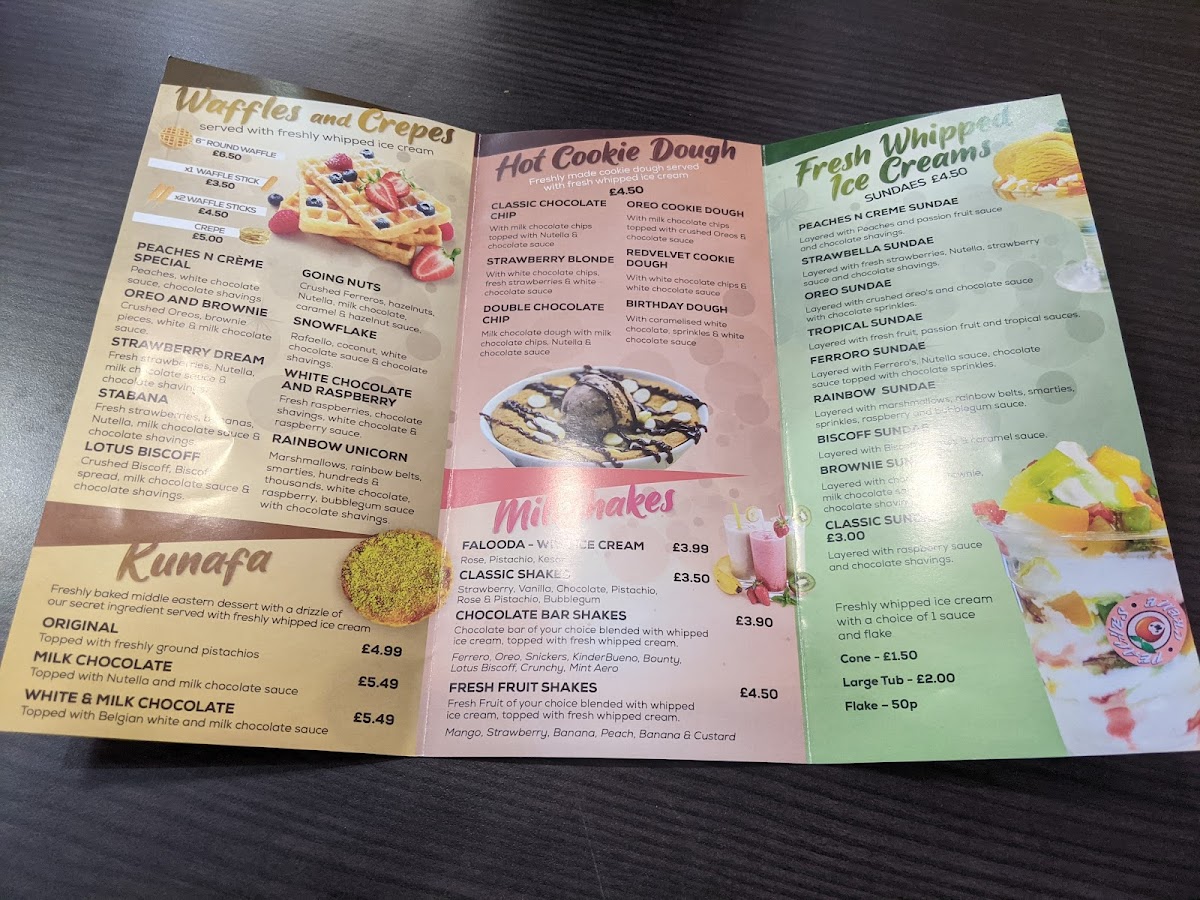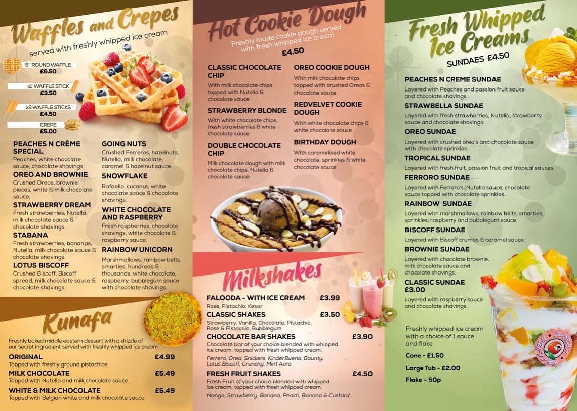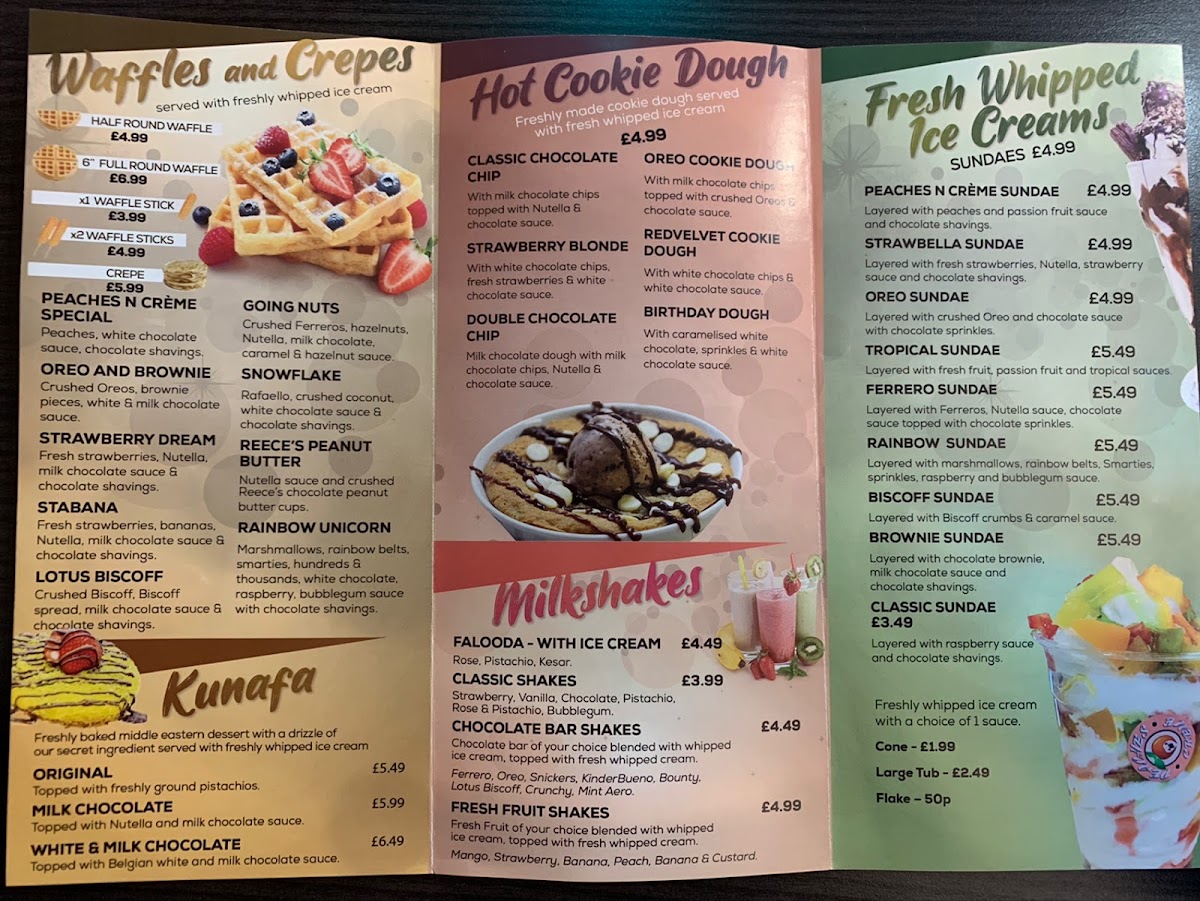 The menu is geared towards dessert lovers seeking a variety of sweet treats and beverages in a casual, quick-order setting. It supports light dining occasions, suitable for afternoon or evening visits. Contact details and location are provided for convenience.