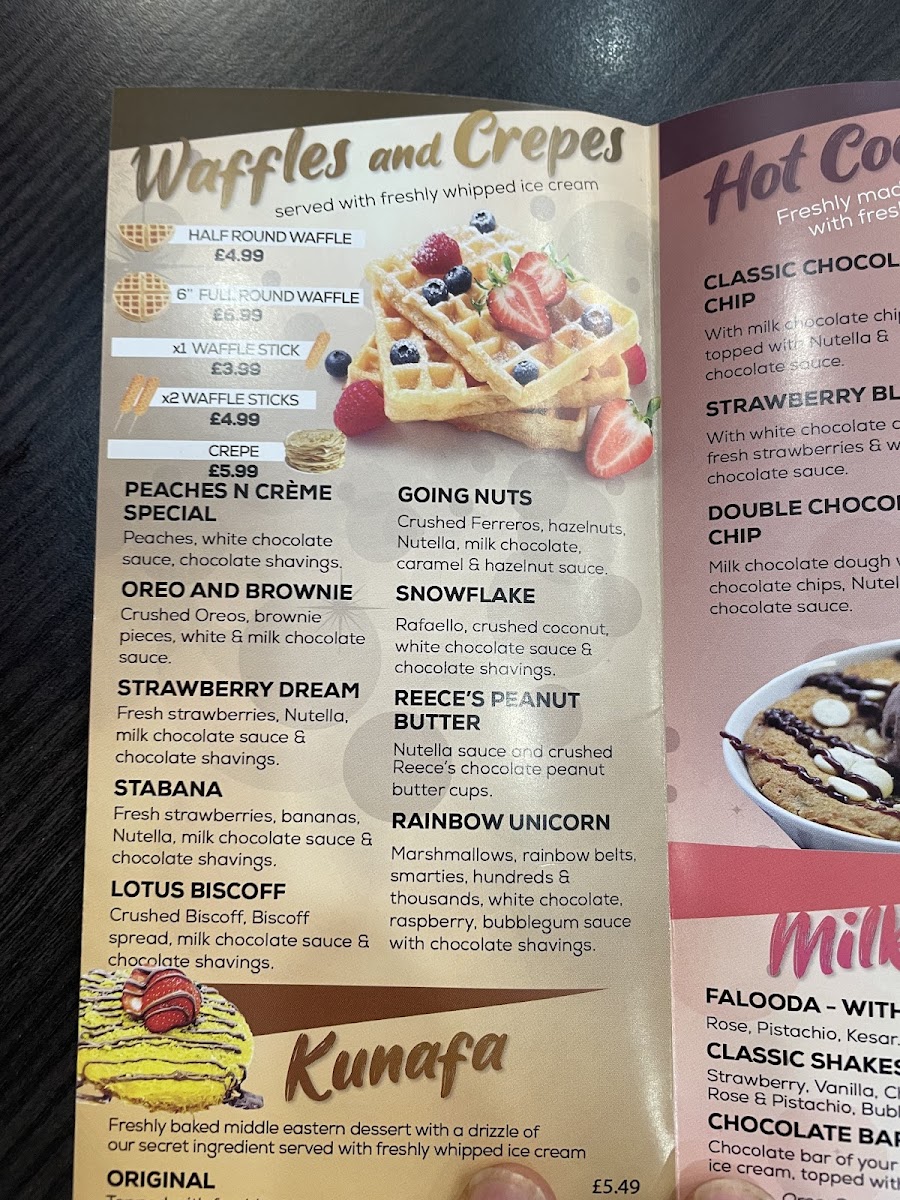 - Kunafa: Traditional and varied versions of kunafa available in Original, Milk Chocolate, and White & Milk Chocolate. These items typically serve as a sweet main dessert choice.